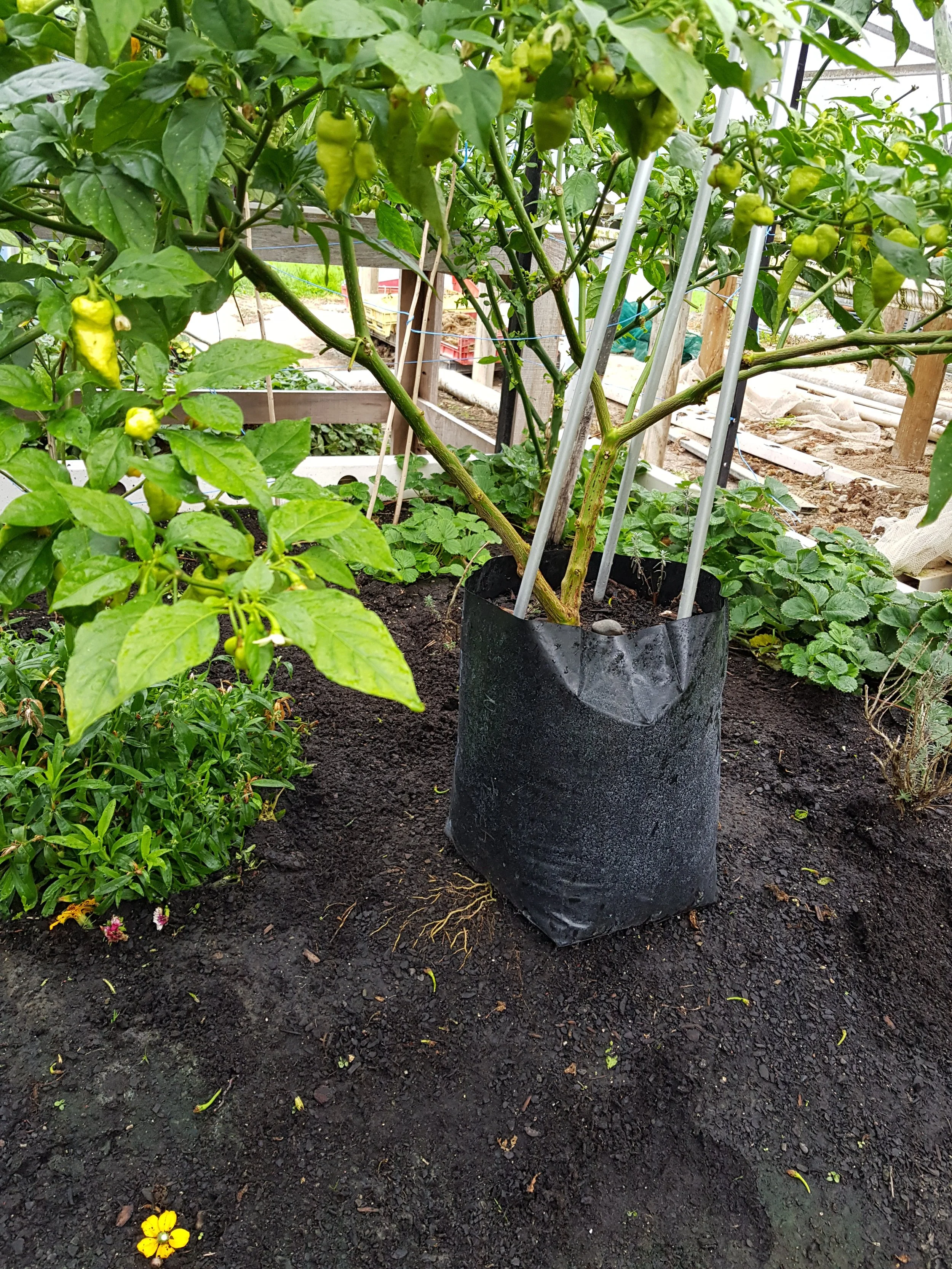 Chilli plants interplanted with marigolds and basil in the tunnel house.
